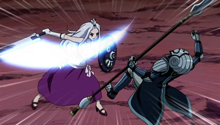 Espada y Escudo Mágicos: Mirajane usó una espada para el ataque, cubriéndose con el escudo, contra el Ejercito Real de Edolas.