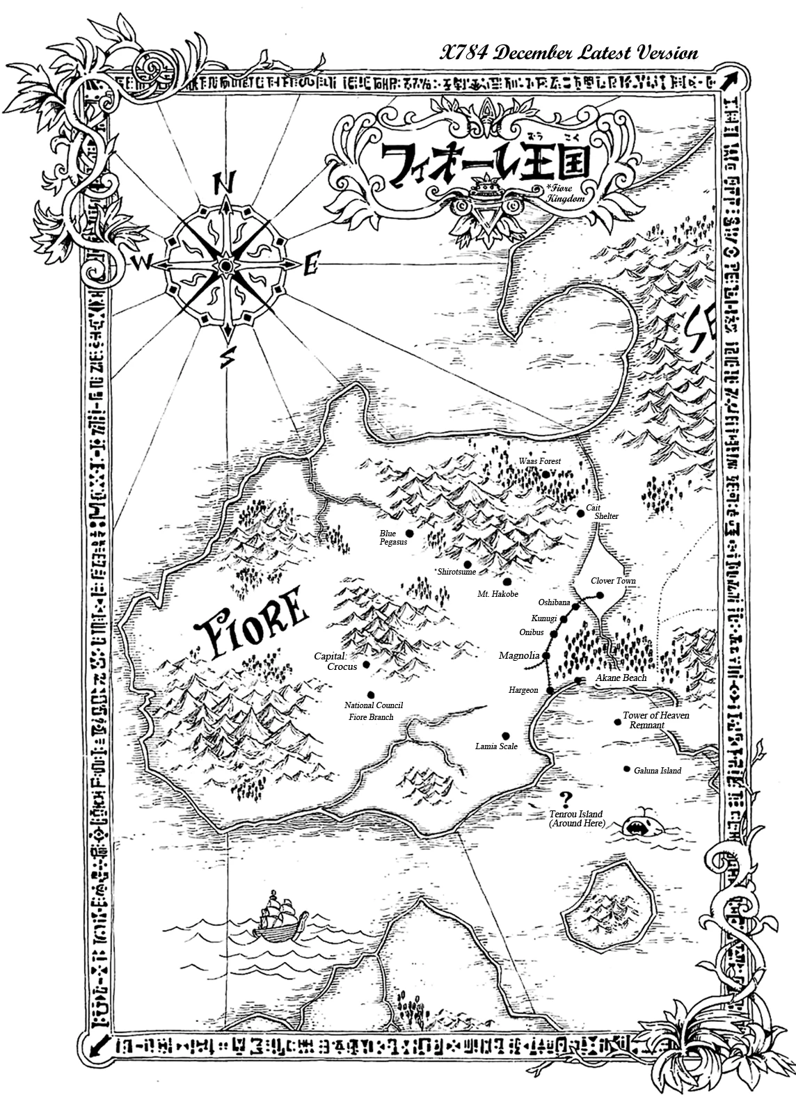 Fiore se encuentra en la península más occidental. Está rodeada por océano por tres lados y tiene fronteras terrestres con Bosco y Seven. Además, Caelum y Fiore combinan sus rutas comerciales marítimas.[3]