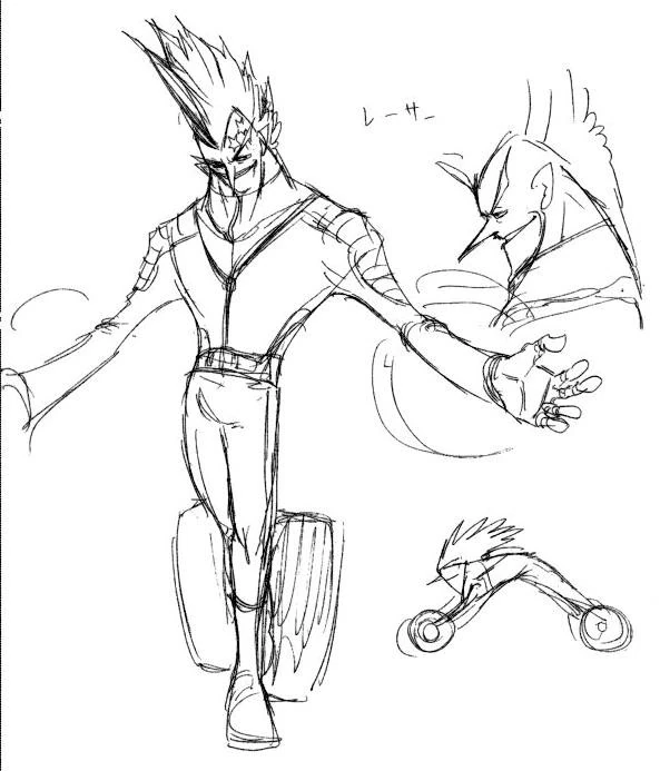 - El concepto original de Racer se suponía que era más musculoso, más viejo, y sin gafas de sol. También se suponía que en vez de invocar motos, el mismo tendría unas ruedas con las que correr.