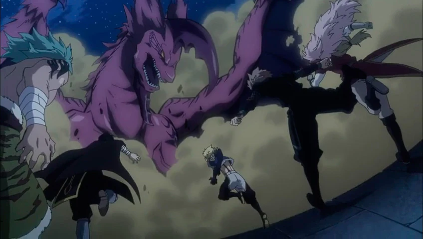 Al cabo de un rato de pelea, Sting y Rogue muestran signos de cansancio frente a Mard Geer, sin embargo su batalla es interrumpida por un extraño sonido que Sting y Rogue no son capaces de identificar. Por su parte Mard Geer se pregunta si "eso" ha venido a por el demonio gigante o a por Zeref, dando a entender que sabe qué es lo que se avecina. Entonces, ambos Dragon Slayer se quedan paralizados y comienzan a reaccionar con lo que se acerca, el dragón negro Acnologia. Un poco más tarde, ambos se reponen y se preguntan dónde está Mard Geer el cual ha desaparecido aprovechando el estado en el que se encontraban Sting y Rogue.