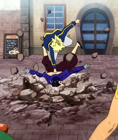 Entonces Sting pide a su compañero que se quede atrás, con la confianza de que él será suficiente para derrotar a los magos de Fairy Tail él solo. Sting se lanza a por los magos de Fairy Tail a gran velocidad sin que éstos pudieran verlo siquiera. Los magos de Fairy Tail deciden devolver el ataque y ambos comienzan a lanzar golpes a Sting al mismo tiempo, sin embargo el mago de Sabertooth consigue detener sus ataques con facilidad.