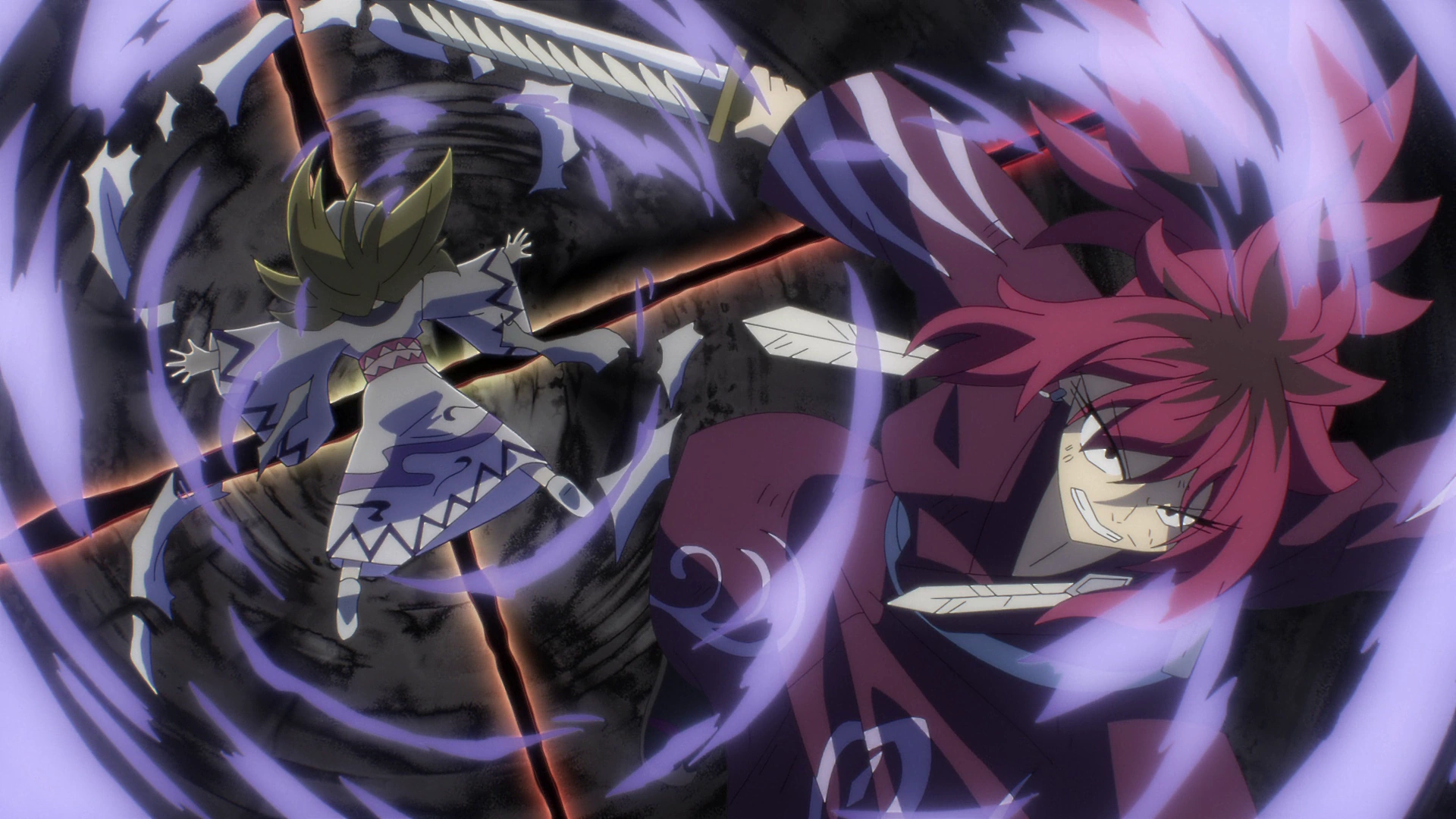 Eventualmente, Suzaku se topa con Natsu Dragneel quien está dispuesto a cobrar revancha por lo sucedido en Elentir. El mago de Diabolos asegura que la derrota de su rival está garantizada por segunda vez, y comienza la batalla con un veloz corte de su espada, sin embargo, gracias a las escamas del Modo Rey Dragón de Fuego, Natsu sufre daños menores y con esta nueva táctica él es capaz de parar los cortes de su oponente usando sus manos desnudas. Suzaku pregunta cómo fue capaz de haberlo superado en tan poco tiempo, y Natsu asegura que él aprendió a leer sus movimientos y arremete con su puño de fuego, aunque es bloqueado por la espada rival, recibiendo un corte de ésta misma en su hombro. El hada está decidido a darle el golpe final con su Puño de Destrucción del Rey Dragón de Fuego no obstante queda asombrado cuando Suzaku lo bloquea y contraataca con su Corte del Purgatorio Negro del Inframundo, pese a que ambos recibieron hechizos de alto nivel, aún se encuentran de pie y mal heridos.