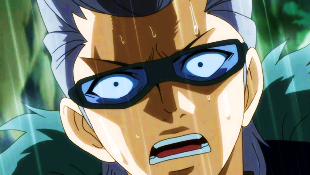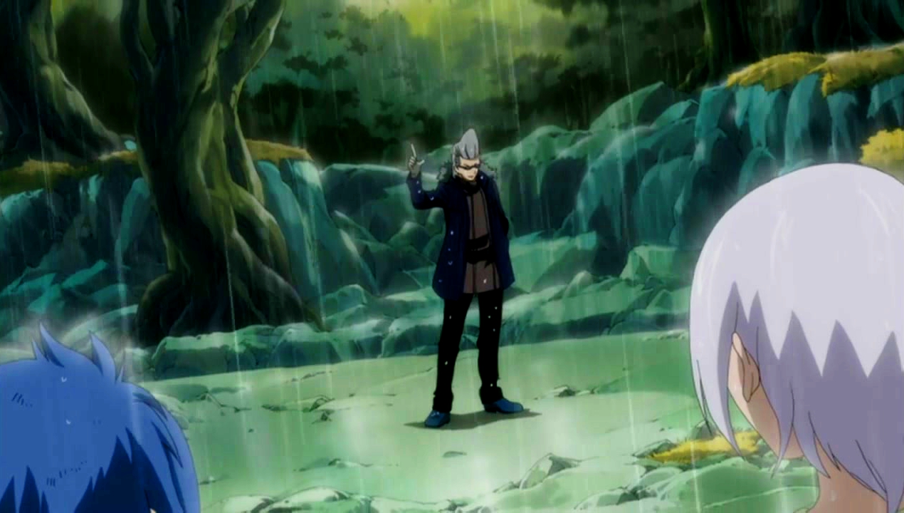 Elfman usa quindi la sua Magia Take Over per trasformare il suo braccio destro in una replica dell'artiglio di Rustyrose e si prepara a colpire. Agitato, Rustyrose trasforma rapidamente la sua mano sinistra in uno scudo dorato "che respinge qualsiasi cosa", e l'attacco viene bloccato. Rustyrose sorride, ma poi si rende conto che i suoi occhiali sono stati rimossi. Elfman dice che il suo vero bersaglio erano gli occhiali di Rustyrose e procede a romperli con la mano. Quindi dice a Evergreen di pietrificare Rustyrose prima di abbassarsi. Mentre Evergreen usa i suoi Occhi di Pietra, Rustyrose la fissa dritta, urla, e fingendo di essere pietrificato. Rustyrose, imperturbabile, dice "sto scherzando" e li taglia entrambi ancora una volta con il suo artiglio e si vede poi che ha ancora un paio di occhiali sugli occhi.