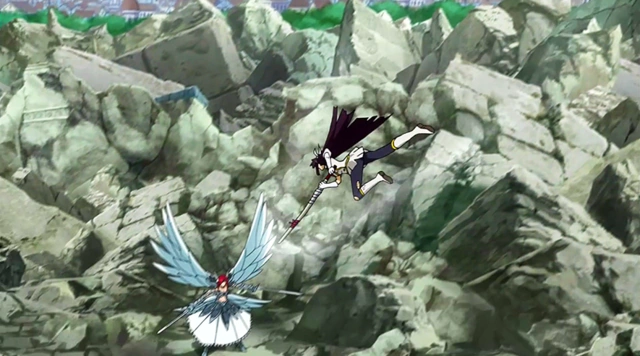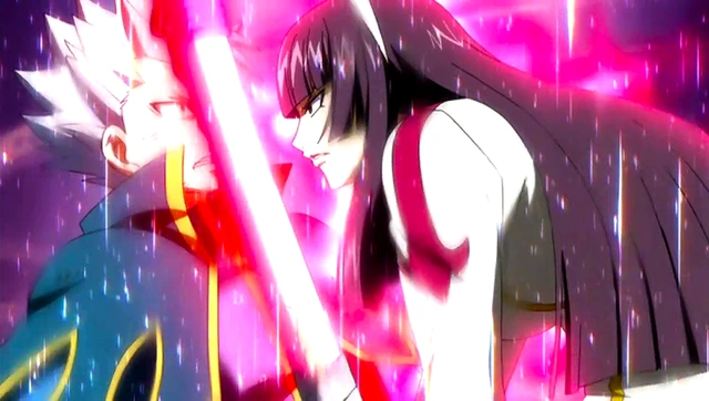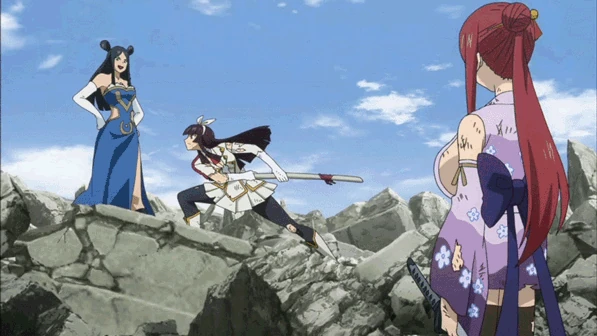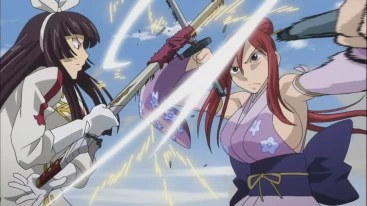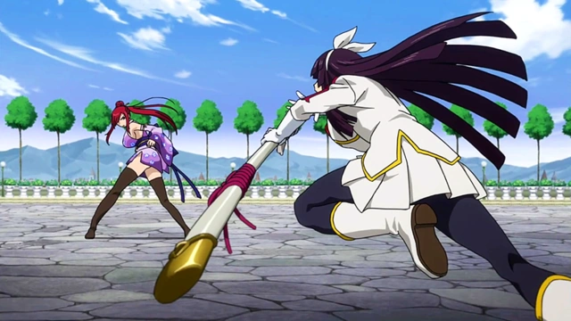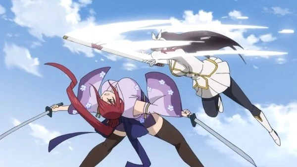 Kagura combatendo Erza em um duelo de espadas