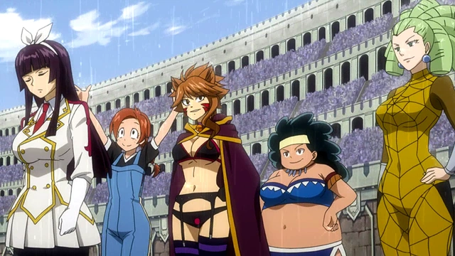 Logo quando ela e as outras guildas voltam a Hargeon ela é zoada por Dimaria que diz que mesmo depois do que aconteceu ela ainda tem coragem de voltar lá, logo Erza se junta com Kagura para a batalha.