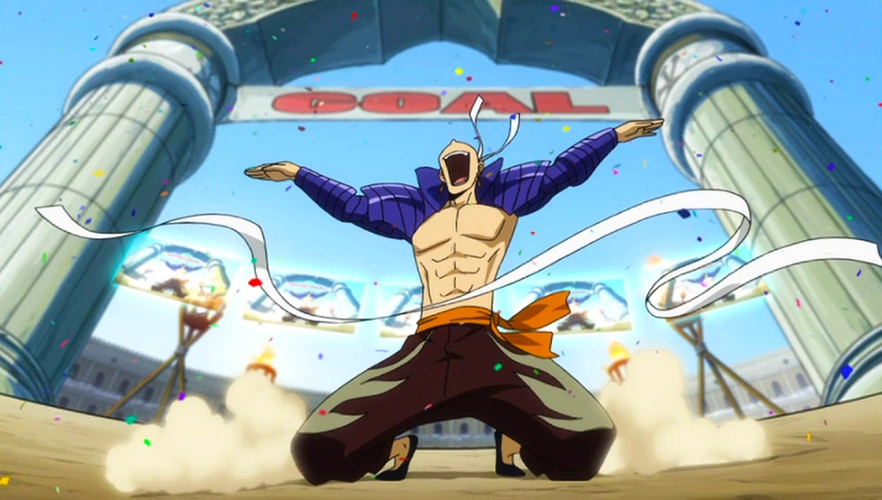 Bacchus later participates in the second day's event, Chariot.[11] Though initially in fifth place behind Kurohebi of Team Raven Tail, Ichiya of Team Blue Pegasus, Yuka of Team Lamia Scale and Risley of Team Mermaid Heel due to the hangover from the night before, after seeing the effort everyone else in the race was putting out, Bacchus uses his immense strength to destroy some of the chariots, causing his opponents to lose their balance and enabling him to overtake them, gaining first place and winning 10 points for his team. Makarov then proceeds to compliment Bacchus' ability, proclaiming his shock not knowing Quatro Cerberus even had such a man in their guild.[12]