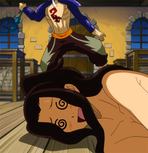 Their battle commences but Elfman cannot land an attack. Bacchus starts commenting about how he'd spend his night with Mirajane and Lisanna,[14] angering Elfman and causing him to transform into his Beast Soul: Weretiger.[15] But not only does Bacchus manage to dodge Elfman's attacks, he also manages to attack him with his use of Chop Hanging Fist. After enduring a few attacks, Elfman gets up and places his wager in their bet: if he wins the match, Quatro Cerberus will have to change their name to Quatro Puppy for the rest of the Games.[16] Hearing this, Bacchus starts drinking from his bottle of alcohol and prepares to use Drunk-Chop Hanging Fist. He lands several hits on Elfman but soon discovers how bruised up his palms are afterwards. He sees that Elfman has transformed into Beast Soul: Lizardman before he attacked, thus causing injury to his palms. Bacchus gets excited and the two Mages continue their battle, with him on the offensive, and Elfman trying to defend himself with his newly gained scales. As the clash comes to a conclusion, Bacchus remarks that Elfman is a real man before collapsing utterly defeated, in stark contrast to everyone's expectations. Thus, Elfman wins and gains Team Fairy Tail A 10 points.[17]