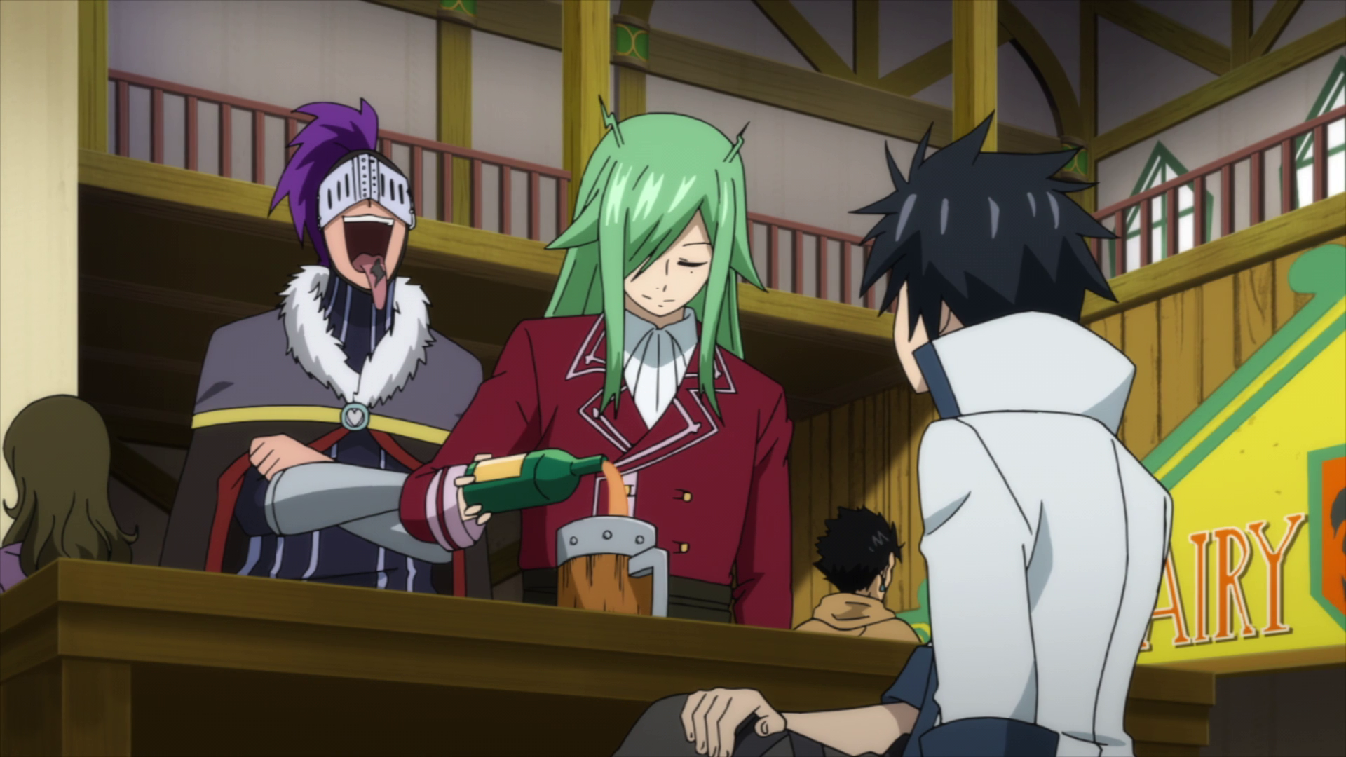 Bickslow appears, along with Fried and Evergreen, at the Fairy Tail guild welcoming back Lisanna. Lisanna is surprised, saying that it was rare to see them around the guild.[29] Moments later, he and Nab instigate a guild brawl.[30] When Makarov announced Fried as a participant the S-Class Mage Promotional Trial, Fried chose Bickslow over Evergreen to be his partner for the exam.[31]