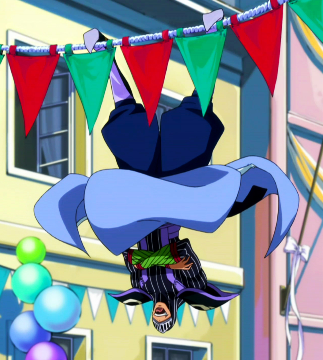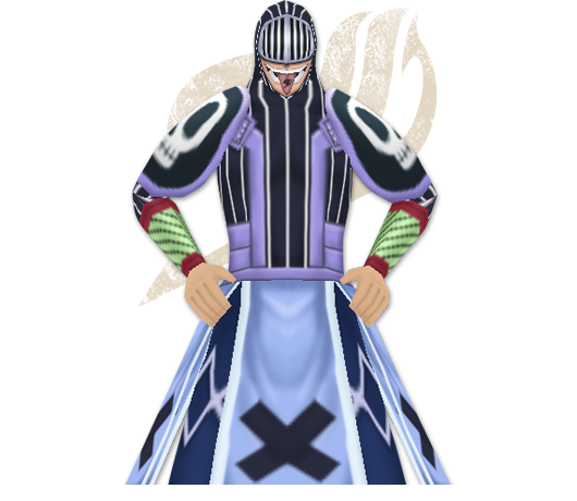 Bickslow’s upper body is covered in a dark, mildly fitting cloth covered in vertical white stripes, which extend up to his head to cover it in a tight hood, exposing only his hands and face. The upper part of the latter, however, is almost always obscured by a metal visor reminiscent of a Medieval sallet, which comes covered with eight small, elongated holes, with four of them in front of each of his eyes, allowing him to see, but preventing others from being affected by his Figure Eyes. He wears large armbands, and he has large shoulder pads each with skulls on its center. His waist is circled by a simple dark band, which holds up a massive waistguard made of cloth, which comes in four long, light-colored pieces, each adorned by a dark "X", reaching down below his knees. Under such waistguard, Bickslow dons a pair of extremely baggy, loose dark pants, with each leg being adorned by a pair of lighter-colored belts crossing in an "X" formation. Such pants are tucked inside a pair of light, armored greaves.