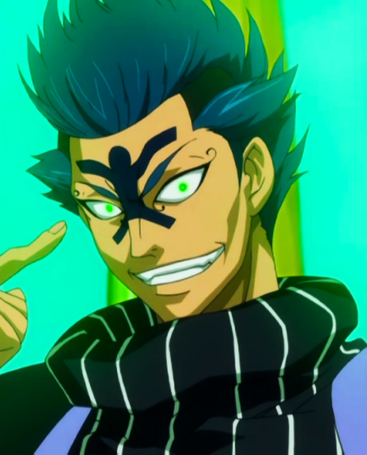 Bickslow is a tall man with a mildly muscular build and broad shoulders. His hair is blue and black in color, with the black parts being almost shaven, and the blue ones, occupying the top and the sides of his head, being much longer, with the one of the top being styled in a mohawk-like crest, and the ones on the sides pointing backwards. Bickslow’s large eyebrows are also blue, and the upper part of his nose and his forehead bear the tattoo of a stylized man extending his long, curved arms outwards. His irises each have a concentric circle surrounding the pupils inside them. He also has prominent eyelashes ending in a spiraling curved motif, each placed at one of his large eyes’ sides; the pair of eyelashes pointing towards his nose are headed downwards, while the outer ones jut upwards. Below his eyes are two slightly curved lines pointing downwards. His black Fairy Tail Stamp is located on the upper part of his own tongue, often visible due to him sticking it out.[3] Until recently, Bickslow applied dark nail polish to his fingernails.