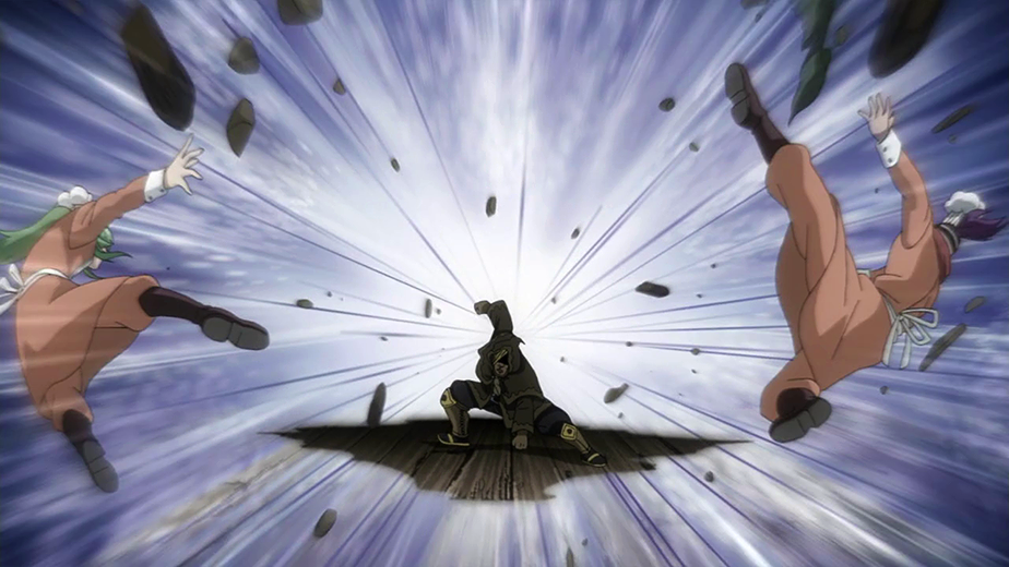 While working at 8-Island with the rest of the Thunder God Tribe and Laxus, Yajima and Fried discuss the infiltration of the Council, to which Bickslow notes that all nine Council members have been murdered. As Yajima contemplates over the catastrophe, Bickslow humorously remarks that it was favorable of Yajima to have renounced his position from the Council, which irritates Yajima due to the distasteful nature of the remark. As Evergreen walks by and scolds her team for not taking their job seriously, Bickslow and Fried mention how Evergreen's uniform does not suit her. After Evergreen mentions how they selected a simple job, Yajima claims it is far from simple, but Bickslow acknowledges his prowess in arrangements. As Yajima questions Laxus' whereabouts, Bickslow questions whether he is lost or not. After a figure whom was presumed to be Laxus walks in, he creates a massive tornado, damaging the restaurant and sending Bickslow and co. afar. As the perpetrator lunges towards Yajima, Bickslow and Fried both shield the former Council member to no avail, as the attacker swiftly assaults the two.[84]