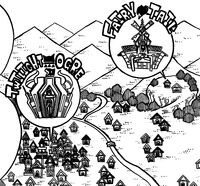 Fairy Tail's original location was situated in the Kingdom of Fiore, on the southern coast of the country in Magnolia Town where it was the only guild[5] (until the arrival of Twilight Ogre). It was located in the south of the town not far from the coast, and the guild was situated about 4-5 kilometers up the Magnolia central path.[6] When the core members of Fairy Tail disappeared for 7 years, the remaining members could no longer afford to keep Fairy Tail's first building so it went into foreclosure.[7] After they left it, they moved into a small tavern, that lies on top of a small hill, and made it their base of operations.[8] Though upon arriving back in Magnolia town after their victory at the Grand Magic Games, the guild's first building has since been rebuilt in the center of the city by the people of Magnolia town as a reward for their victory in the Grand Magic Games.[9]