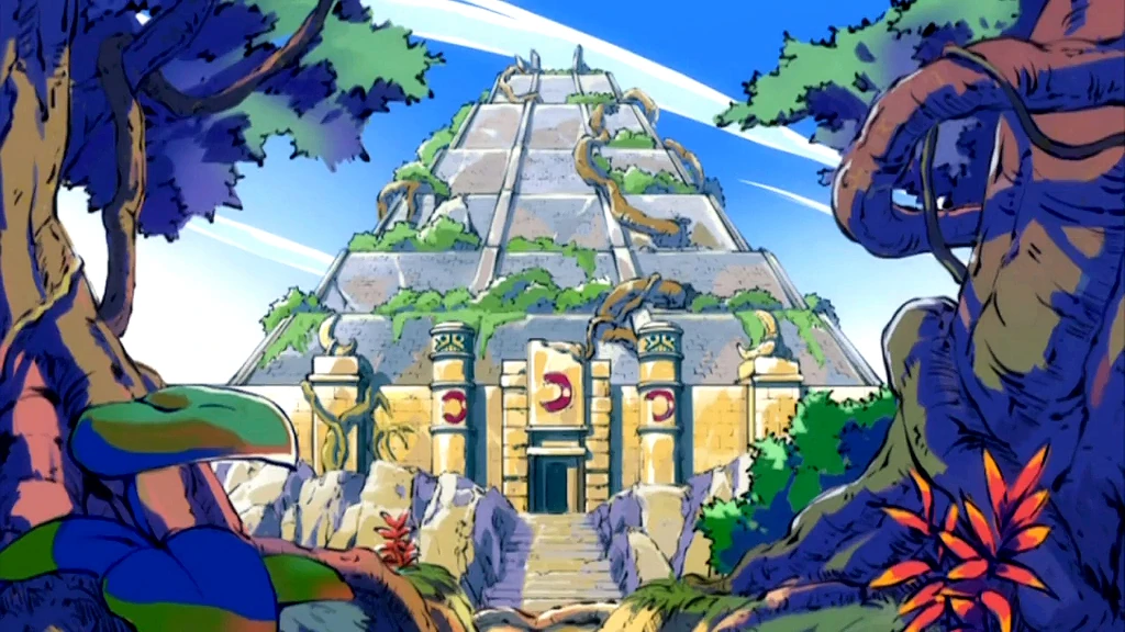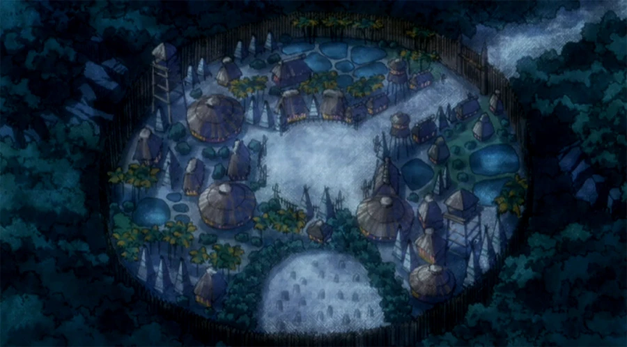 Galuna Island is located far east of Hargeon Town. It is far into the sea, with no other land visible around it. It is shaped like a crescent moon with small islands extending the area, covered by a large number of trees, green plants, vines and steep rocks which make it harder to hike.[4] A small village lies within the island with a very tall gate. The gate has a sign stating,"Keep Out". Above, sharp spikes line the gate. On both sides, there are two large posts, and on the top are two large spikes connected to those posts. A wall encircles the entire village to further protect it from outsiders.[5] Located within the walls are many huts with guard towers watching the whole village with torches lighting the area. An ancient temple also lies on the island. It has succumb to age with most of its walls being cracked and plant life growing atop it. The ancient floors can barely support any weight, as seen when Natsu Dragneel put too much force into his step and sent him and the rest of his team falling through the now cracked floors.[6] Below the temple is a series of caves and tunnels, one of which housed the Demon, Deliora, encased in iced shell.[7]