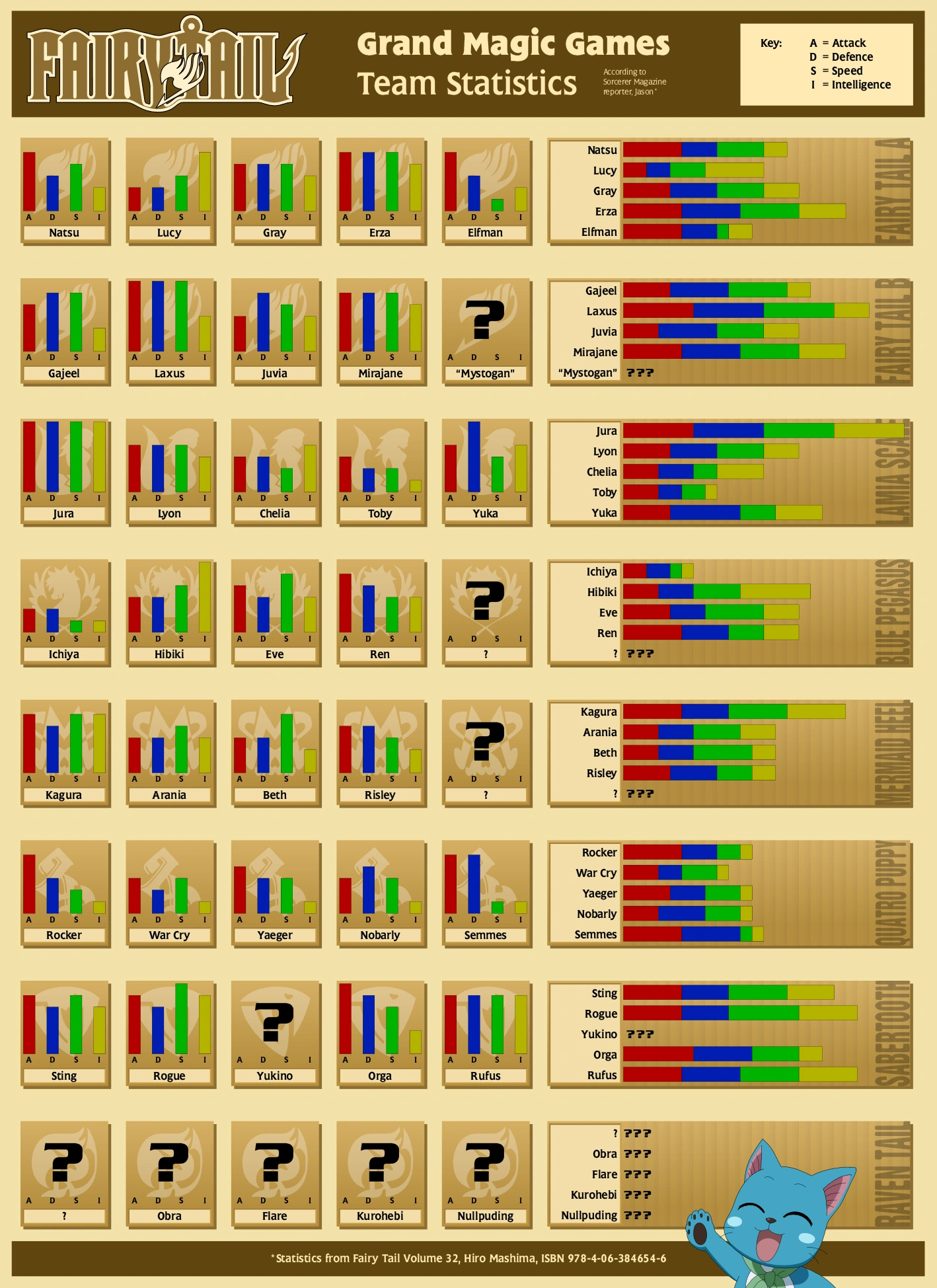 - In Volume 32's extra content, Mashima provided the battle statistics for 31 of the 40 X791 contestants in the Grand Magic Games. The stats, however, were provided not from Mashima's point-of-view as the author but from the view point of Sorcerer Magazine reporter Jason, which explains why some stats are missing and why others may be inaccurate. Each contestant was rated by Attack, Defense, Speed, Intelligence, and a special stat that was unique to each contestant. For example, Mirajane Strauss' "special stat" was "Pin-Up." The stats were set on a scale from 1 to 5. Although the scale was supposed to stop at 5, the highest any character could get in any stat was COOL! which was slightly above 5. In Jason's opinion, Jura Neekis had the highest stats out of the 31 contestants and Ichiya Vandalay Kotobuki had the lowest.[31]