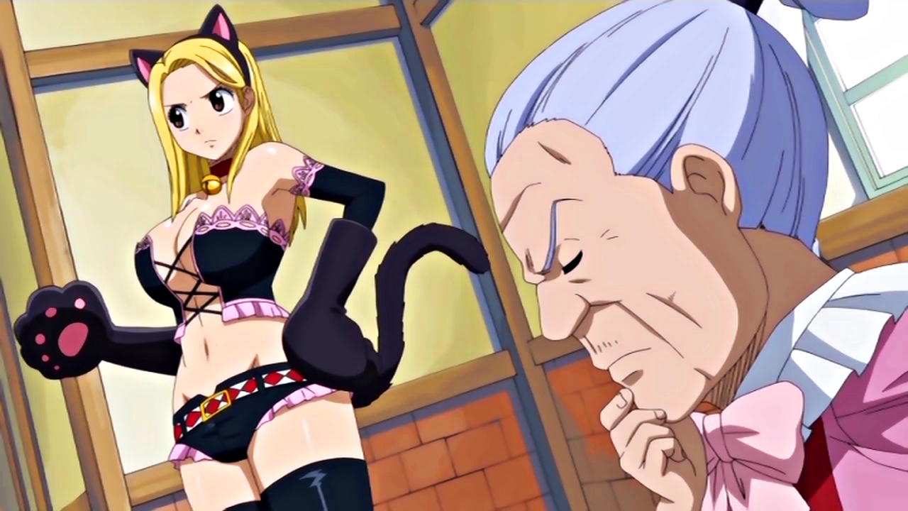 Hilda posts a request to find something without any reward to be given. Mirajane tells Lucy to investigate the odd request since it was not recorded in the Acceptance of Orders book.[9] When Lucy arrives at Fairy Hills, Hilda starts inspecting her to make sure she is really a female. When Lucy passes her inspection, Hilda introduces herself as the matron and the one who sent the request. She then orders Lucy to wear a sexy cat costume in order to do the job. When Erza looks out of the window and sees Lucy, Hilda suddenly disappears.[10]