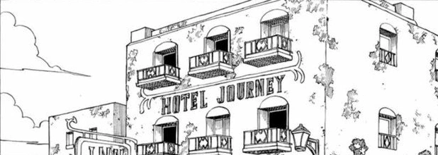 The building is composed of multiple windows and some balconies located at its front. A sign reading "HOTEL JOURNEY'" is plastered here, with a miniature sign hanging on the left-hand side reading "INN."[1]