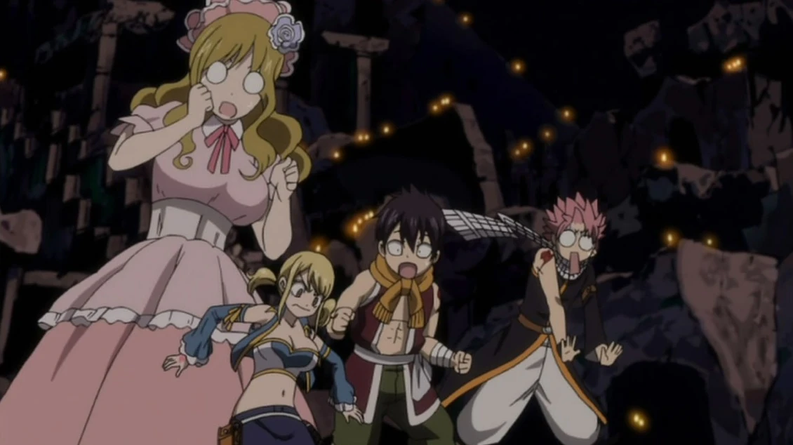 When the group lands, they find themselves in a room filled with statues, which "Michelle" explains to be coffins. When Natsu activates a trap by punching a coffin, "Michelle" selects the correct bridge to follow but later the group is forced to jump, after meeting a dead end. Then, Happy is asked to lift Lucy and "Michelle", and he complains due to Lucy being heavy, but when a rock falls on his head Lucy uses Fleuve d'étoiles in order to save him, "Michelle" and herself. "Michelle" and the rest decide to keep going down and reach the lowest part of the graveyard, where the party meets Dan Straight and Coco.[11]