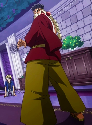 Jiemma is a tall, elderly man distinguished by his massive, extremely muscular physique, untarnished despite his advanced age. The man has long light hair which is tidily gathered on the back of his head and tied in a braid, which reaches down below his middle back, and is secured near its end in a large tuft;[4] the thick beard and mustache covering Jiemma's lower face, linked to his hair by the Master's sideburns, are untamed, with several spiky strands jutting outwards from the latter one. He has marked facial features and a long, massive and mildly rounded nose. His sunken eyes, topped by light and bushy eyebrows, are very distinctive, being almost completely white, as if they lacked pupils, and has a black underlining around his lower eyelid; something which gives him an otherworldly look. Jiemma's small, dark Sabertooth mark is located in the center of his high, mildly wrinkled forehead. During his introduction, Jiemma was portrayed as having a very hairy chest, with his torso and abdominals sporting spiky hair in a shape reminiscent of a cross;[5] this, however, wasn't present in his subsequent appearances.[6]