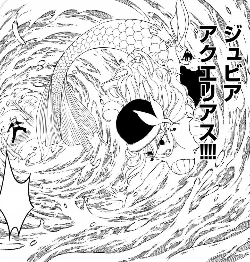 Transformation Magic (変身魔法 Henshin Mahō): Juvia is capable of using Transformation Magic, having first used it in her fight against Gate, turning herself into a Mermaid, dubbing this form as Juvia Aquarius (ジュビア・アクエリアス Jubia Akueriasu), based after one of Lucy's spirits; Aquarius. Doing this apparently gave Juvia more motivation from love and jealousy. Juvia's lower body turns into a Mermaid's tail with a pair of fins on either side, while still bearing her Guild emblem on her left side where her thigh would be. Her attire also changes into just a pair of seashell bikini top, a short skirt around her waist and gold bracelets on her wrists similar to the one Aquarius wears on her arms.[74]