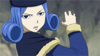 Juvia is first introduced portraying an emotionless face, seeming more secluded from everyone, including members of the Phantom Lord Guild.[10] After she joins Fairy Tail, she develops a happier demeanor.[11] She is obsessed with Gray Fullbuster to the point that her jealousy and paranoia considers anyone who remotely gets close to him a rival even if they show no interest.[12] when Meredy threatened to end him, Juvia loses her calm demeanor and entered a somewhat satanic-appearing state that frightens Meredy and even Erza.[13]