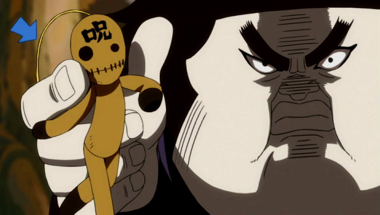 Ushi no Koku Mairi (丑の刻参り Ushi no Koku Mairi): Kain's Magic, a type of Black Magic and Curse Magic called the Ushi no Koku Mairi, allows him to place the hair of himself or from another person onto his doll (Mr. Cursey); however the doll is manipulated, the victim will be manipulated the same way. As for himself, he can exclusively change the properties of his doll (such as turning it into iron), giving himself the doll's properties as well. Using this Magic, he effortlessly defeated three of Lucy's Celestial Spirits.[14] Other forms of Magic can be used in conjunction with this Lost Magic, for example when Natsu lit the right hand of the doll on fire, this was reflected on Lucy, who was under the influence on the doll, without actually damaging her body. Even if the doll's properties are unaltered, the person whose hair is on the doll has their physical strength increased.