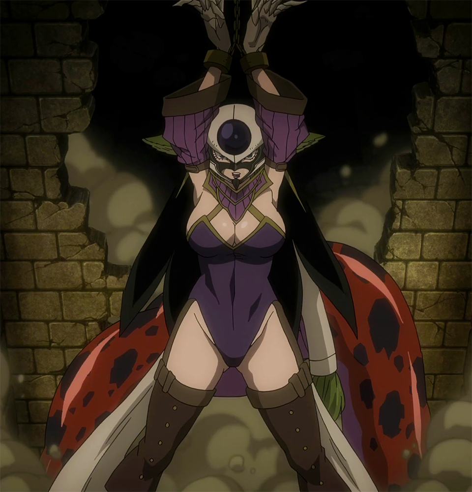 Upon her Guild Master's order, Kyôka looks for reinforcements to aid Tartaros in the battle to come and, as such, travels to headquarters of Succubus Eye. She uses her Curse on the Mages she finds, however none of them are able to withstand her "enhancement" and are turned into small black pieces of paper. Later, Kyôka comes face-to-face with Minerva Orland and explains the situation to the fresh Dark Mage, as well as wondering, aloud, whether she can withstand her "enhancement".[16]