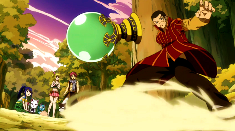 Mest then teleports to Wendy and pulls her away from a spot that a split second later would be filled with explosions. He then shouts for the perpetrator to come out; the perpetrator is revealed to be one of Grimoire Heart's Seven Kin of Purgatory, Azuma, who had been merged into a tree.[50] Mest then explains that he is a Magic Council member looking to find dirt on the guild to put it out of business so that he can earn a promotion. But with Grimoire Heart now on the island, he changes his objective into eliminating the Dark Guild, claiming that he brought along a fleet of battleships with Magic Council's police force; the battleships is then seen in the far background. Unfazed, Azuma mysteriously blows up a group of battleships and then completely detaches from the tree, sarcastically asking Mest if he can begin his own job now.[51]