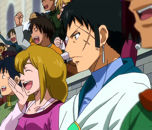 As the final battle of the third day is about to commence, Doranbolt looks at Wendy when her name is called by the announcers.[66] As Wendy and Sherria Blendy meet in the middle of the arena, Doranbolt quietly asks Wendy to do her best,[67] but is shocked upon seeing that both Sherria and Wendy possess very similar forms of Magic, especially Sherria's, a form of Magic meant for slaying Gods.[68] As he watches Wendy with concern, he is suddenly bumped by Team Fairy Tail B's Mystogan, who is pushing his way through the crowd, and seems confused at the Mages presence.[69] Suspicious, Doranbolt stalks Jellal.