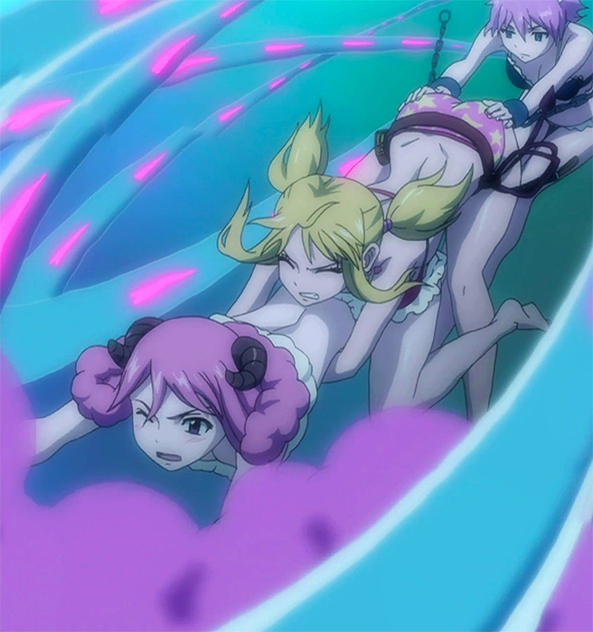 When the event begins, Lucy apologizes to the other participants and summons Aquarius inside the water. Knowing what Lucy is about to do, Juvia quickly attacks with her Water Cyclone, creating a powerful whirlpool-like effect in the water that surprises everyone, even Aquarius herself. All the females in the water then go on the offensive. Using Juvia's attack to her advantage, Jenny lands a kick to Rocker's face and manages to force him out of the water. Sherria tries to use her Magic against Risley but is unsuccessful. While Juvia proves to be even with Aquarius, the Celestial Spirit leaves for a date, much to Lucy's dismay as Juvia attempts to force her out from the water but Lucy is able to save herself, summoning both Aries and Virgo for help. As a comment is made on Fairy Tail A not sending Wendy out, Juvia uses a powerful attack in the water which sends Sherria, Jenny, and Risley out of the sphere. While distracted, Juvia is suddenly taken out of the water herself, leaving Lucy and Minerva the only ones remaining.[3]