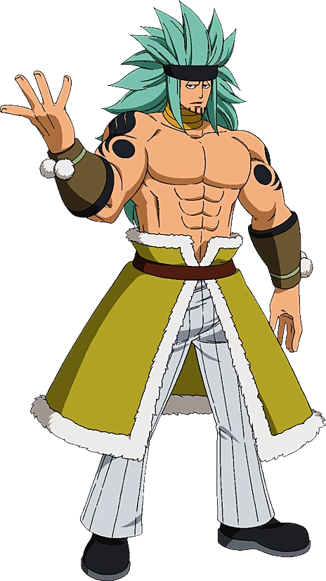 Orga is a pale-skinned, very massive and heavily muscular man, possessing an extremely well-built torso, and matching arms. His legs, however, are normal in size, and, therefore look quite minuscule when compared to his massive body. He has long, spiky, shoulder-length light green hair. Two long spikes fall on either side of Orga's face, framing it, he keeps his hair held in place via a plain black headband over his forehead; his eyes are shown to have white irises (gray in the anime). Orga possesses an elongated, almost rectangular face, with his linear eyebrows being placed diagonally at his eyes' outer sides, pointing upwards; he sports a slight grimace. His massive shoulders and biceps are adorned by large dark tattoos, with each arm bearing a circle flanked by a pair of slender objects, reminiscent of both wings and elongated leaves.[2][3] Orga's face is always shown to be adorned by dark stripes reminiscent of warpaint, which have been shown to vary from time to time: when first introduced, he had four vertical black stripes covering his chin, placed one near the other, resembling an unconventional beard;[3] later on, during the fifth and final day of the Grand Magic Games, Orga's face is instead adorned by a single, dark horizontal stripe, which is placed over the bridge of his nose.[4]