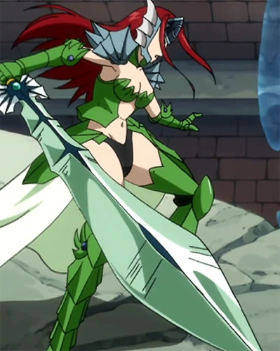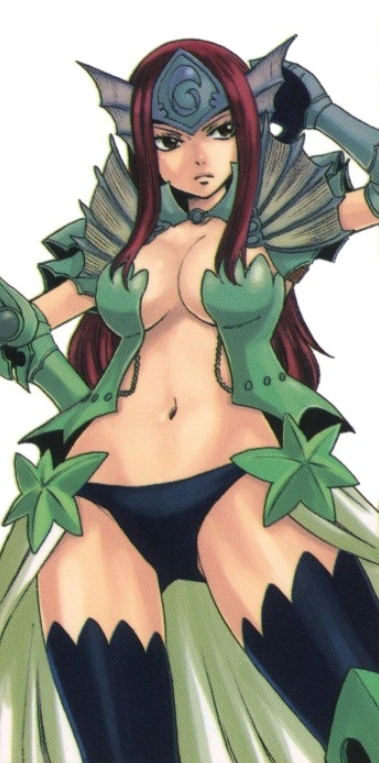 This revealing green armor, complete with bluish portions, has its appearance modeled after different sea creatures. The breastplate, which barely covers Erza’s breasts, somewhat resembles seaweed, and has thin chains hanging from it over Erza’s exposed parts, with a pair siding her breasts and another on her belly; a fifth chain is visible around her neck, which is guarded by the large collar. The breastplate is linked to the pauldrons, composed of green plates and decorated by prominent fin-like ornaments. The gauntlets cover only Erza’s forearms, leaving her biceps exposed, and possess decorated elbow guards with prominent ornaments jutting out in whirl shapes, reminiscent of seashells. The armor lacks a waist guard; instead, Erza is equipped with a dark bikini, and a long cloth, with the edges yet again reminiscent of fins, circling her waist on the back and the sides, being connected to the shorts by a pair of fasteners shaped like sea stars. The greaves possess fin-shaped protrusions in correspondence to Erza’s ankles, and extend up to her knees, with her thighs being covered by jagged pieces made of cloth. The outfit is completed by a headgear, with a large metal part covering her forehead, bearing a whirl-shaped wave on it, and large fin-shaped protrusions siding her head.[1]