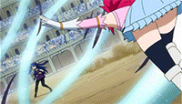 Once the battle begins, Gray uses water provided by Juvia to attack Lyon, However, Sherria uses her Sky God's Dance to intercept the move, protecting Lyon from harm and earning her a compliment from him. As Lyon attacks Gray, Sherria exasperatedly tells him to attack Juvia as well, though he claims that he'll leave attacking Juvia to her, adding on that she should be careful not to injure her, though Sherria claims that he's asking the impossible.[31] With Gray and Juvia exhausted and wounded, Sherria states that it's time for her and Lyon to finish the Fairy Tail Mages off.[32]