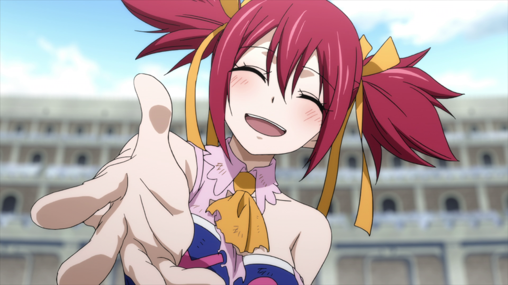 After she is picked up, Sherria apologizes to Natsu for kicking him off of Happy; Natsu quickly deals with Bluenote, defeating him in one hit, but this results in Sherria's top being burnt off by his Magic. After Orochi's Fin surrenders, Sherria travels to a hillside with Wendy and tells her that she acted brashly during the assault because she wanted to prove to Wendy that she would be fine on her own, but adds that she failed. She then tells Wendy that her sibling-like feelings towards Natsu are a type of love and urges her to go join Natsu on his journey to revive Fairy Tail, claiming that they will always be friends regardless of where she goes. That morning, Sherria says goodbye to Wendy, but holds back her tears after she leaves, admitting to Lyon that she wants Fairy Tail to come back too.[48]