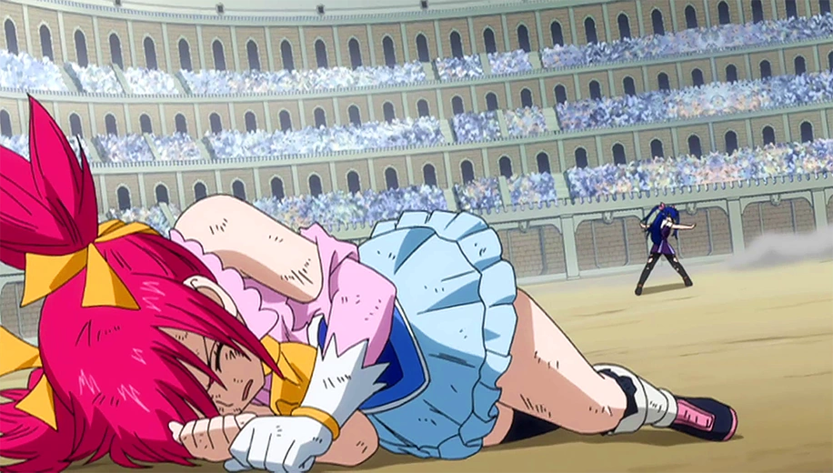 Seeing Wendy injured, Sherria suddenly apologizes and asks if she is okay, but Wendy refuses to give in, once again standing. Sherria suddenly snaps back into a slightly crazed personality, harshly attacking again despite Wendy's wounds. After a brief pause in which both girls eat the surrounding air to replenish themselves, Wendy unleashes Shattering Light: Sky Drill, a powerful attack that sends Sherria sprawling to the ground. However, just as Wendy believes she has won the battle, Sherria stands up again, the wounds she had up until then now healed. As Wendy pants and gazes at her with shock, Sherria asks if she is now willing to give in. Concurrently, Sherria is being watched by Jellal Fernandes in the crowd, who is wondering whether she has some form of connection to Zeref and the malicious Magic Power Crime Sorcière has been searching for.[11]
