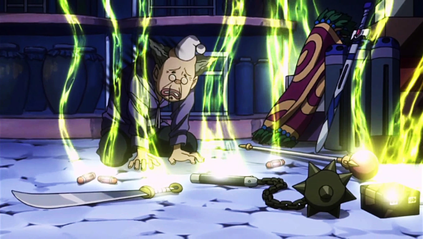 When Natsu Dragneel, Wendy Marvell, Lucy Ashley, Happy and Carla arrive at his shop to buy some Magic items, he offers them the Sealed Flame Blade and Air Shatter Cannon. After learning that Lucy Ashley is the one who will pay for the items, he refuses to accept the payment and tells the group to accept them as his thank you present to Lucy who once saved him from some hoodlums.[1]