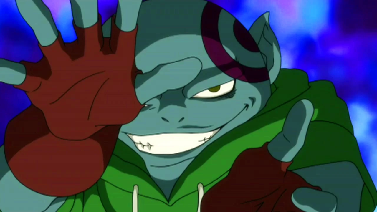 Snarl is a small humanoid being with dark grayish skin and no hair. He bears the mark of his guild on the left side of his head, in between his pointed ears. He has two slits for a nose and usually wears a confident sneer. He wears a green shirt with a hood and a pair of red gloves. He wears brown trousers under a dark white quilt and a pair of black shoes for footwear.
