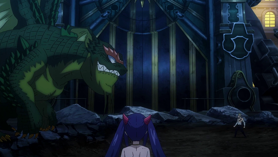 As Laxus attacks Zirconis with his Dragon Slayer Magic, Wendy provides support with Arms, boosting his power; however, Zirconis remains unaffected by the assault.[5]